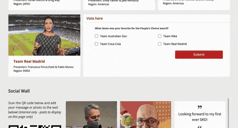 Even though most of the experiene was pre recorded, we added a few ways for attendees to interact with activities like fun quizzes, games, surveys, scheduled winner announcements and a social wall.